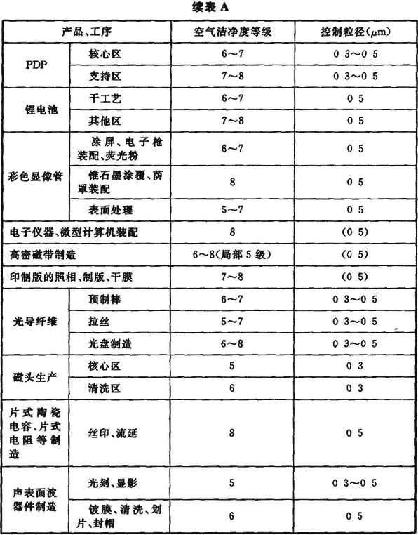 附錄A 各類電子產品生產對空氣潔凈度等級的要求