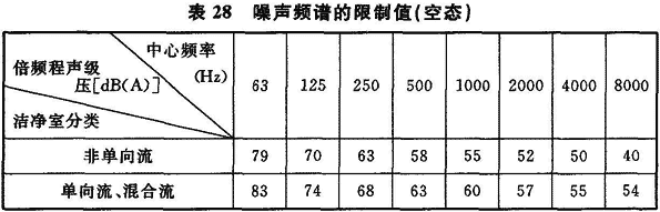14.1.4 電子工業潔凈室(區)的噪聲頻譜限制值,應采用倍頻程聲壓級,各頻帶聲壓級不宜大于現行國家標準《潔凈廠房設計規范》GB 50073-2001的規定,現將該規范的相關規定摘錄在表28中。