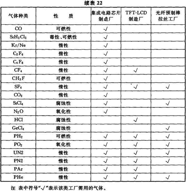 10.1.1 潔凈廠房使用的氣體有常用氣體、干燥壓縮空氣及特種氣體三大類,根據各種電子產品品種及其生產工藝的不同,使用氣體的品種、純度及雜質含量是不相同的。表22是幾類電子產品所需氣體品種。