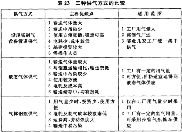 10.2.1 常用氣體主要包括氫氣、氮氣、氧氣、氬氣和氦氣,在電子工廠中它們的供氣方式主要有三種:第一種是在電子工廠內或鄰近處設制氣裝置,采用管道輸送至用氣廠房、車間或設備;第二種,外購液態氣體,在電子廠房內設液態氣體儲罐、氣化器及氣體過濾、調壓、輸配裝置,由管道送至用氣廠房、車間或設備;第三種,外購瓶裝壓縮氣體,瓶裝壓縮氣體有單個鋼瓶或鋼瓶集裝格或長管氣瓶拖車等形式,在電子工廠內設壓縮氣體鋼瓶儲存、氣體分配裝置或匯流排,再由管道輸送至用氣廠房、車間或設備。表23是三種方式的比較。