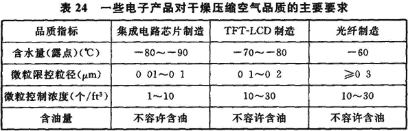 2 電子產品生產過程對干燥壓縮空氣的含水量(或露點)、含油量、微粒粒徑及其濃度的要求較為嚴格,表24是一些電子產品生產工藝對干燥壓縮空氣品質的主要要求。
