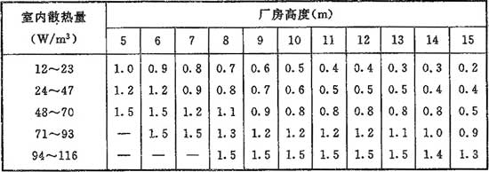 H.0.3 散熱量有效系數m值宜按相同建筑物和工藝布置的實測數據采用,當無實測數據時,單跨生產廠房可按下式計算: