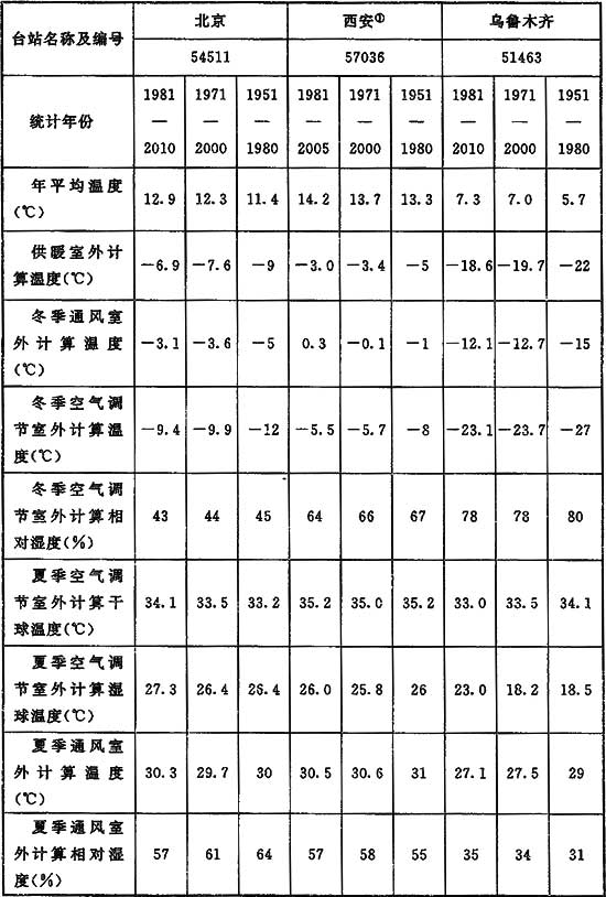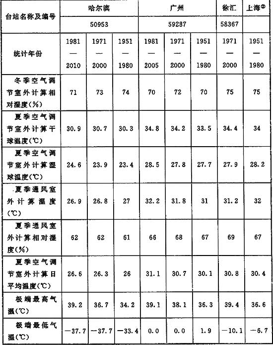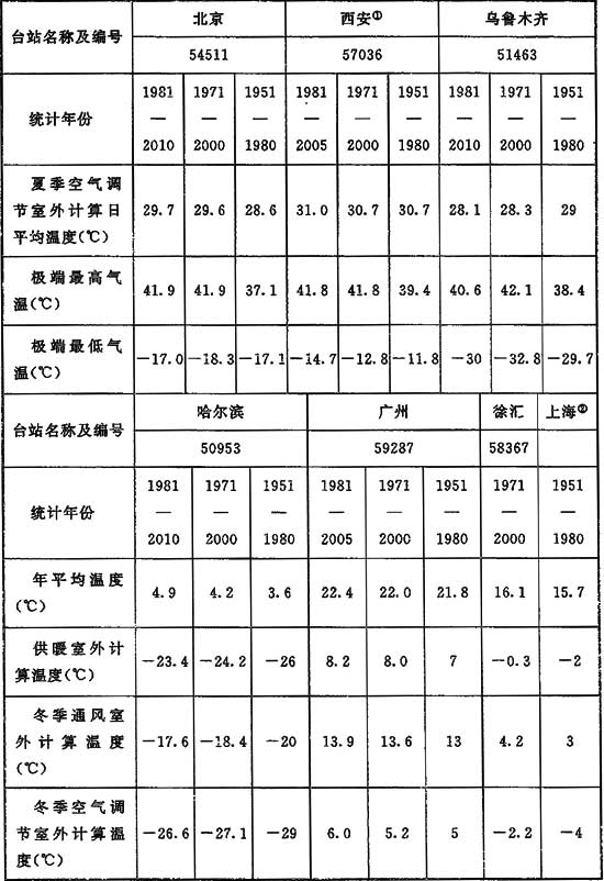 據氣象學人士的研究:自20世紀60年代起,烏魯木齊、青島、廣州等臺站的年平均氣溫均表現為顯著的上升趨勢,21世紀前幾年,極端最高氣溫的年際值都比多年平均值偏高。同時,20世紀60年代中后期和70年代中期是極端低溫事件發生的高頻時段,20世紀70年代初和80年代初是極端高溫事件發生的低頻時段,20世紀90年代后期是極端高溫事件發生的高頻時期。因此,室外空氣計算參數的結果也隨之發生變化。表16可以看出1951-1980年的室外空氣計算參數最低,這是由于1951-1980年是極端最低氣溫發生頻率較高的時期;1971-2000年由于氣溫逐漸升高,室外空氣氣象參數也隨之升高,1981-2010年則更高。考慮到近兩年來冬季氣溫較往年同期有所下降,如果選用1981-2010年的計算數據,對工程設計尤其是供暖系統的設計影響較大,為使數據具有一定的連貫性,編制組在廣泛征求行業內部專家學者意見的基礎上,最終決定選用1971-2000年作為本標準室外空氣計算參數的統計期,形成表A.0.1(注:即本規范表A.0.1-1)。