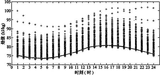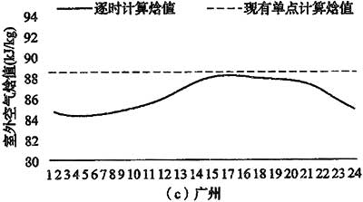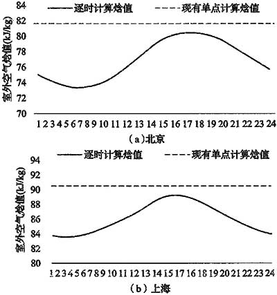 在現有的單點新風焓值計算中,均采用室外空調計算干、濕球溫度確定設計焓值,即采用累年平均每年不保證50h的干、濕球溫度。編制組認為對于逐時計算焓值曲線,其峰值應該與觀有不保證50h的濕球溫度對應。通過對北京、上海、廣州、哈爾濱、西安、成都等城市的夏季逐時新風計算焓值的統計,發現24時刻分別不保證7小時的空氣焓值中的最大值,與全年不保證