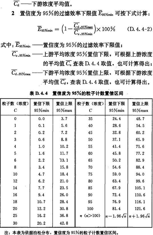 2 應根據上游95%置信下限的粒子濃度Cu,95%min和過濾器最大允許透過率(0.01%),計算下游允許最大濃度,再根據表D.4.4查得或計算下游允許最大濃度的95%置信下限濃度Cd,95%min。
