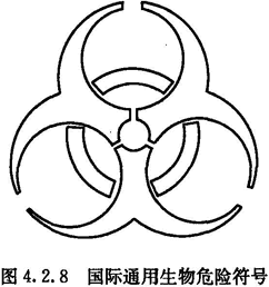 4.2.8 二級、三級、四級生物安全實驗室的入口,應(yīng)明確標(biāo)示出生物防護級別、操作的致病性生物因子、實驗室負責(zé)人姓名、緊急聯(lián)絡(luò)方式等,并應(yīng)標(biāo)示出國際通用生物危險符號(圖4.2.8)。生物危險符號應(yīng)按圖4.2.8繪制,顏色應(yīng)為黑色,背景為黃色。